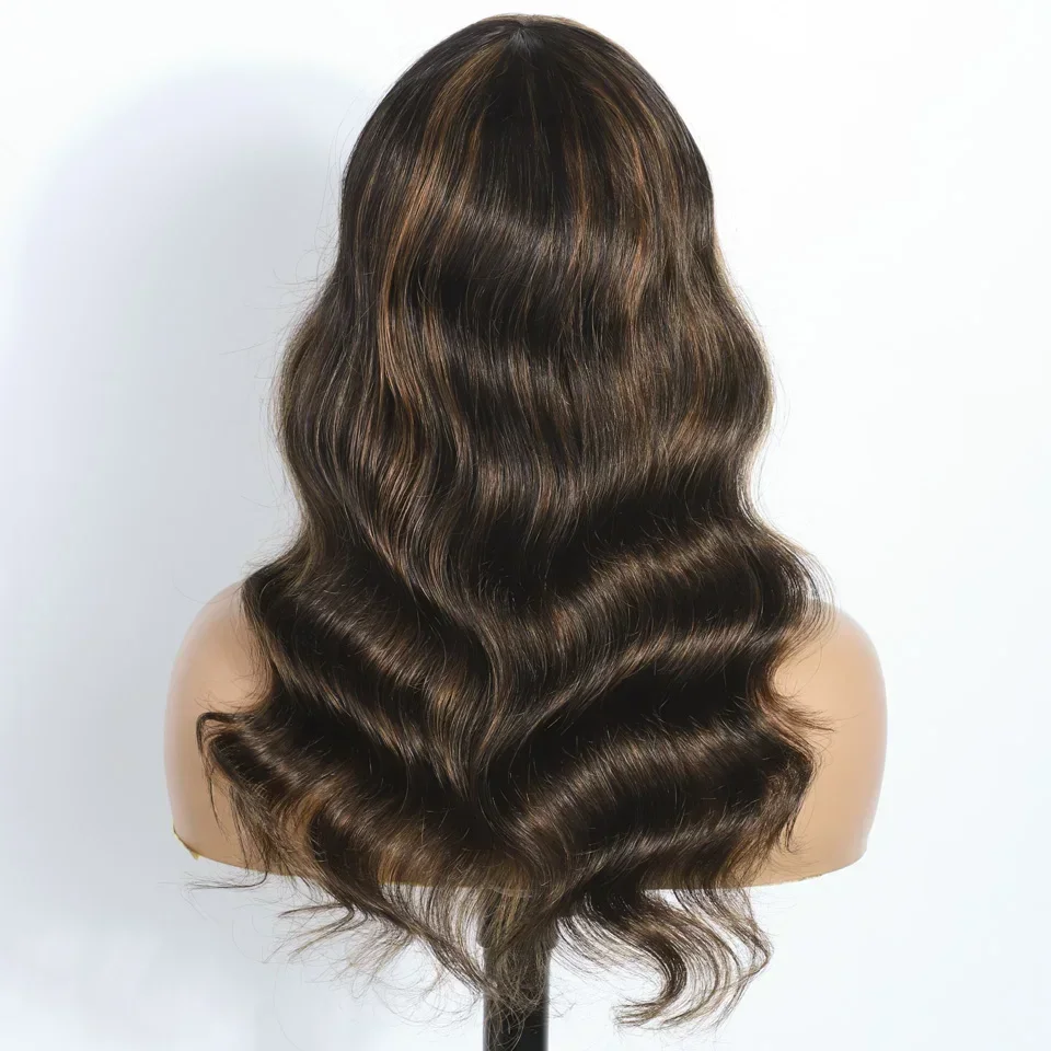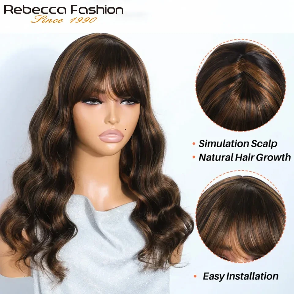 180D Highlight Body Wave Human Hair Wig With Bangs Put On And Go Ombre Blonde Peruvian Body Wavy Human Hair Wigs For Women